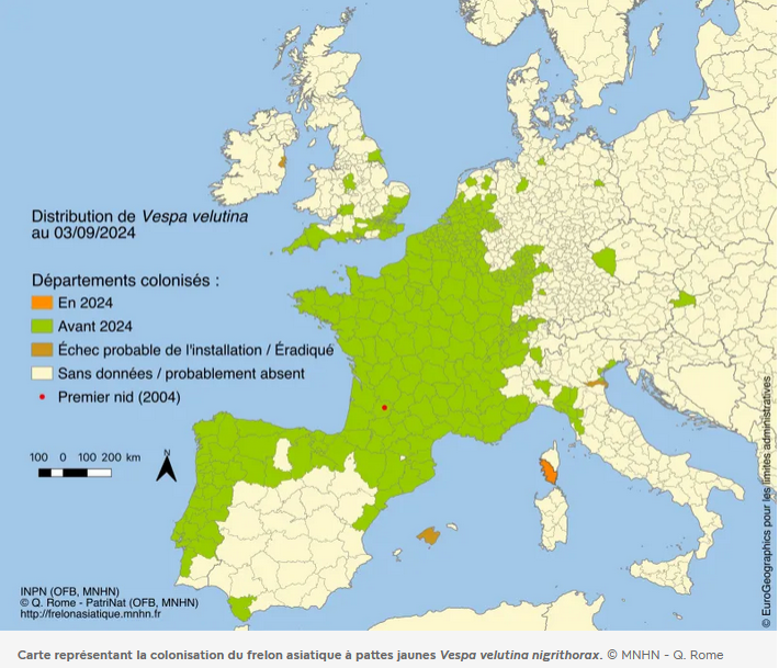 Le frelon asiatique semble être arrivé en France en 2004 dans un lot de poteries chinoises transportées par bateau. Le premier individu a été identifié dans le Lot-et-Garonne. Le climat et le manque de prédateurs font que l’espèce peut progresser d’environ 100 kilomètres par an en Europe…