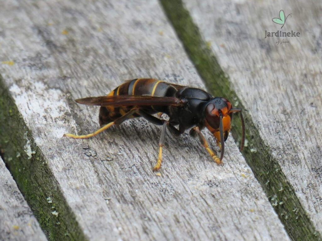 Puis en un coup, Robocop est apparu 😱 ! C’était un frelon asiatique, Vespa velutina nigrithorax ! Impossible de le rater. Il s’est posé sur la table et est resté sans bouger pendant quelques minutes, le temps que je le photographie. A ce moment-là, je me suis dit « Mais que dois-je faire ? L’éliminer à cause des dégâts qu’il fait par chez nous ? Le laisser tranquille ? « . Le temps que je réfléchisse, il avait déjà disparu 🐝…